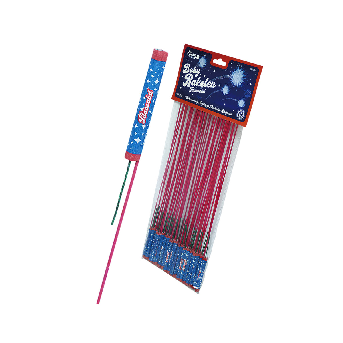 Baby-Raketen mit Silberschweif-Aufstieg zu Titanfunken-Blitzknall. 50 Stück pro Packung.
