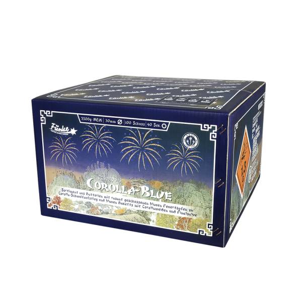 Sortiment aus Batterien mit rasant geschossenen blauen Feuertöpfen zu Corolla-Schweifaufstieg und blauen Buketts mit Corollaweiden, mit abschließender Finalsalve.