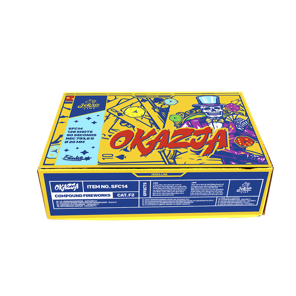 128 Schuss Verbundfeuerwerk im Z-Shape mit verschiedenen Showeffekten in 20mm Kaliber.