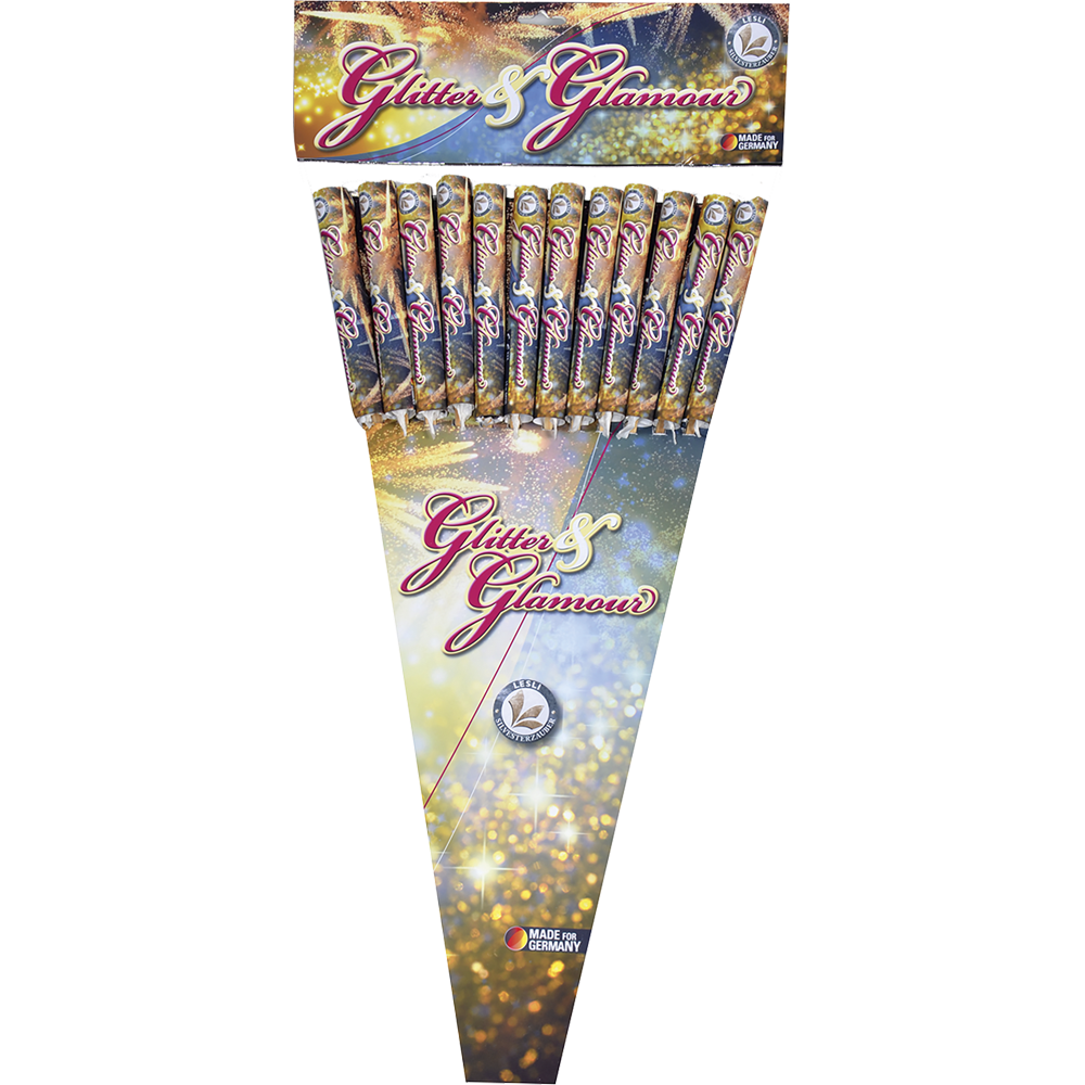 12 Stabraketen mit Blitzknall und kräftigen Effekten in rot, grün, blau und violett.