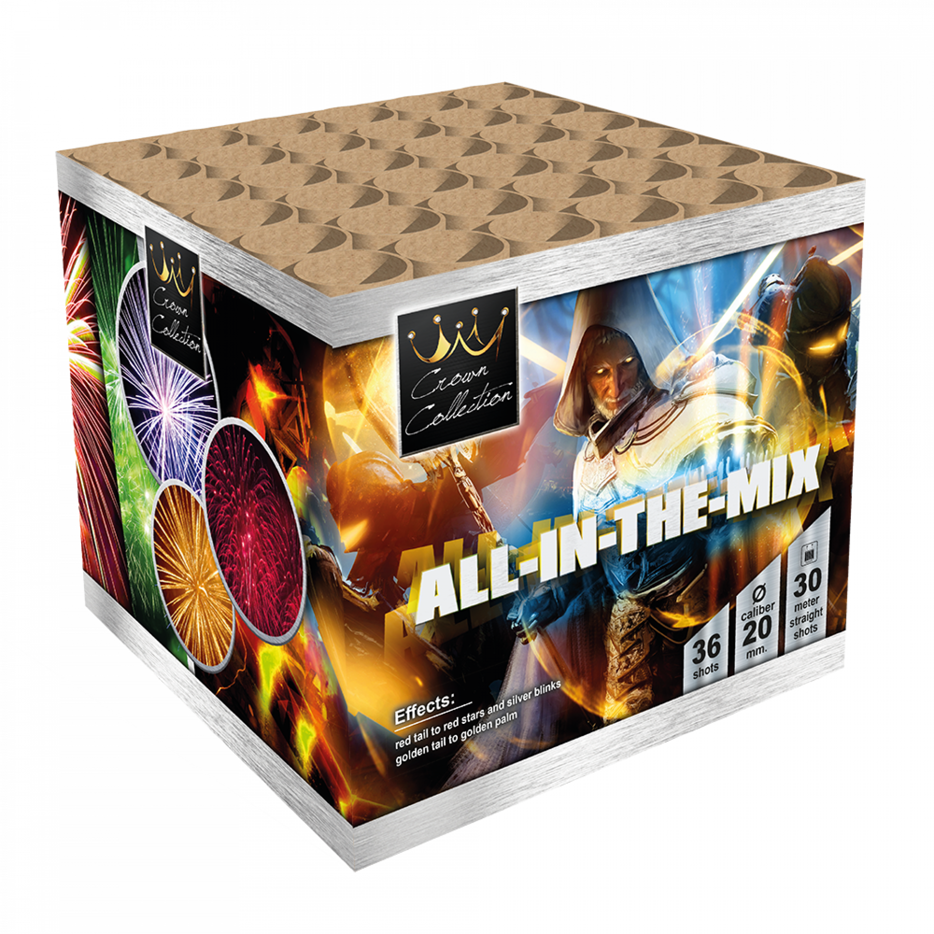 Magnum Feuerwerk besticht durch Premiumprodukte. Die Crown Collection von All in the Mix hat 36 Schuss mit 20mm Kaliber und sehr schöne Effekte.