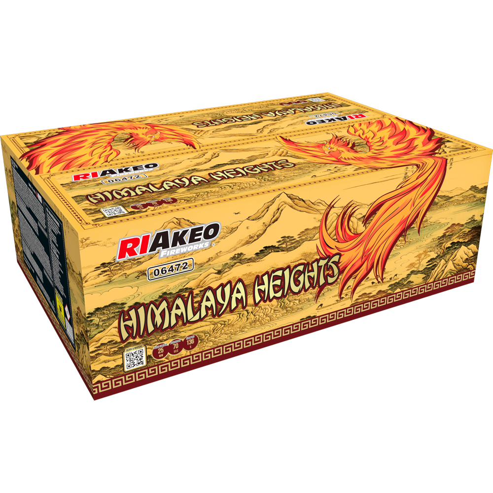 Himalaya Heights ist eine Premiumbatterie aus dem Hause Riakeo mit tollen Verbund und 1951g NEM. 136 Schuss mit 25mm Kaliber in schneller Schussfolge sorgen für ein Staunen am Himmel.